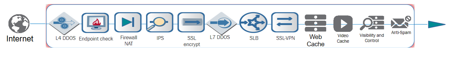 而且为了安全和合规的要求,往往会在互联网出口区域采用“糖葫芦串儿”的方式堆积多种安全设备,类似下面这样的网络部署: